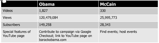 La campagne a été fortement suivie sur Youtube avec plus de 120 millions de vues via 1800 vidéos postées par le candidat soit 6 fois plus de vidéos postée que Mc Cain.