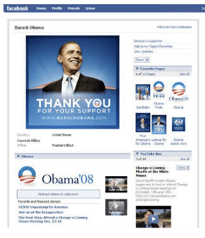 Obama a su tirer parti des réseaux sociaux pour sa campagne politique. Souvenez-vous : » Ce 21 avril (2008) à 13 heures, M. Barack Obama lance ainsi une initiative hors du commun à l’adresse des internautes : il s’agit de recueillir 1 million de dollars en 1 minute. Impossible ? En janvier dernier, l’homme a réussi l’exploit de réunir 32 millions de dollars versés à 90 % par des dons de 100 dollars via Internet. En mars, il collecte encore 40 millions de dollars. » source