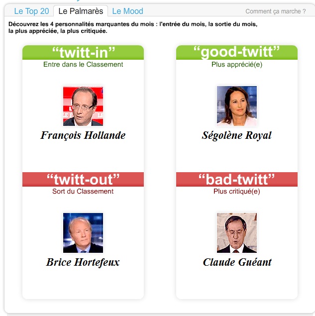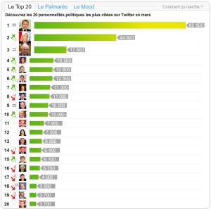 Avec l’arrivée des présidentielles 2012, nos candidats français surfent également sur la vague des réseaux sociaux comme le souligne le Twittoscope politique de TNS Sofres, TF1 News, Metro et Semiocast : premier baromètre de l’opinion politique dans la perspective de la présidentielle 2012, sur le réseau social Twitter.