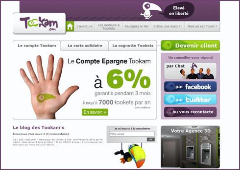 Il s’agit d’une agence bancaire exclusivement en ligne basée sur l’intégration des médias sociaux et de services « solidaires ». TOOKAM.com place notamment FaceBook, au cœur de la relation entre le client et son conseiller. Il existe également une option de tchat et des fonctionnalités 3D pour organiser des rendez-vous et des présentations.